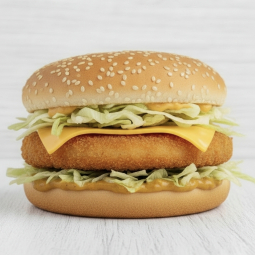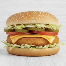 котлета куриная, свежий помидор, огурчик консервированный, сыр чеддер, салат листовой, соус сырный, булочка для гамбургера с кунжутом