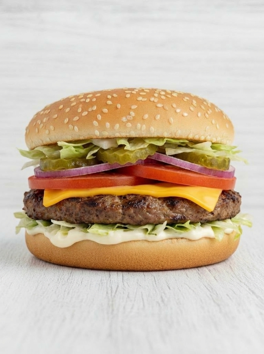 котлета из говядины, свежий помидор, сыр чеддер, лук красный, салат листовой, соус майонезный, булочка для гамбургера с кунжутом